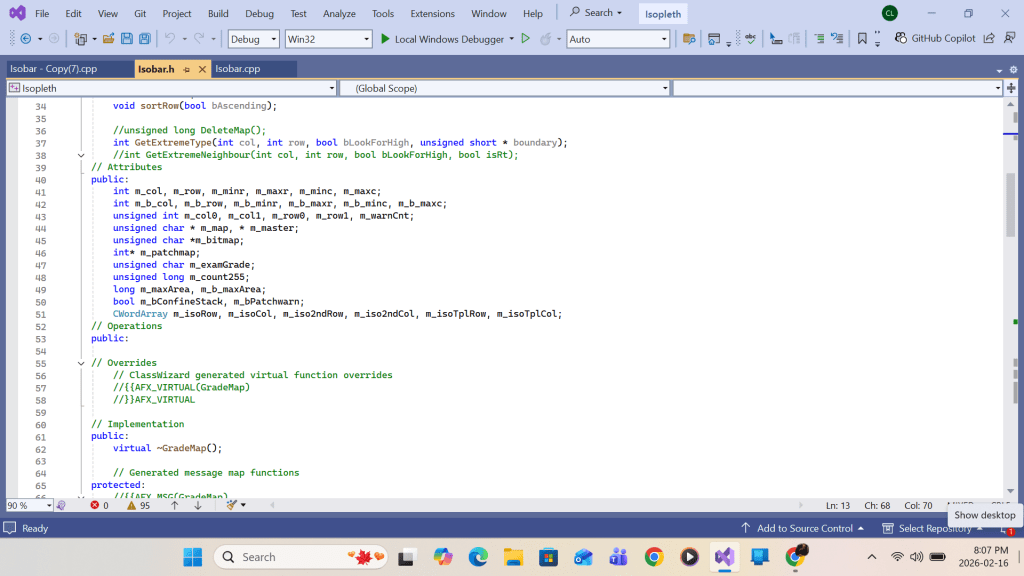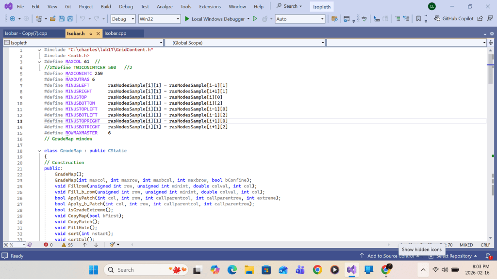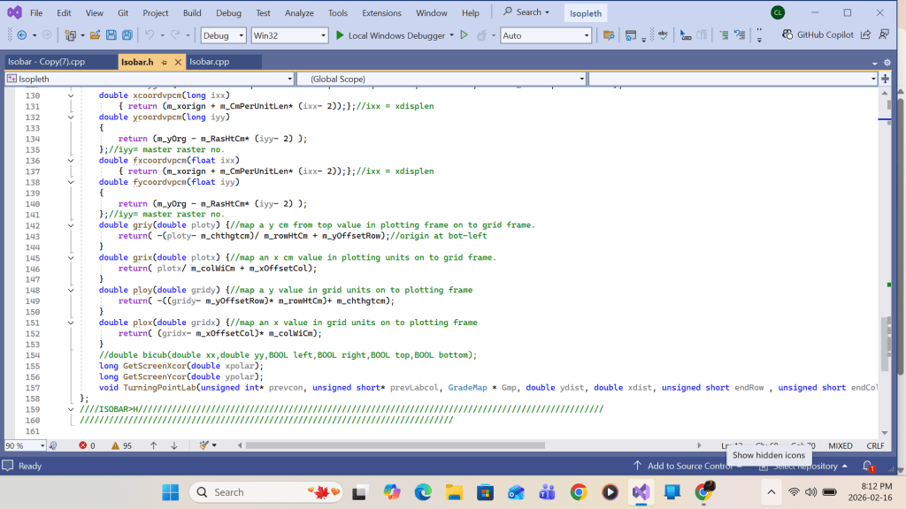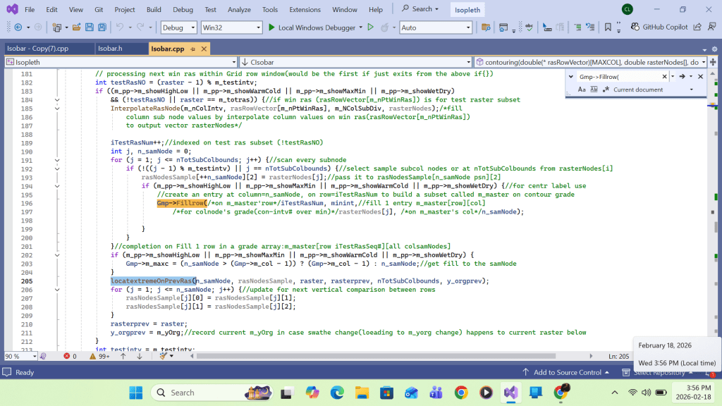 Summing up, upon return from the primary function Apply_b_Patch call at each grid(I,J), the following work will be completed for the white space area enclosing the primary grid: contour intersection queue sorting, queue elements’ contour-interval-number re-grouping, contour intersection retrieving/linking, and turning point labeling. Upon completing the loop over all grids (I,J), drawing all contour lines with turning point labels within the swathe area would be complete. Detailed implementation using Visual C++ code is shown in the screenshots that follow.